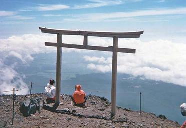 | Keywords: MtFujiTorii.jpg Torii near summit of Mt Fuji Honshu Japan volcano volcanic cone english wikipedia uploaded by en User Fg2 on 03 Jul 2004 en User Fg2 released in english wikipedia under PD by author Fg2 Climbing Mount Fuji Wooden torii MyĆjin-torii |