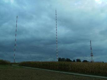 | Keywords: Muehlacker radio masts2.JPG en Radio masts of Mühlacker transmitter Left Backup transmission mast height 130 metres Middle Main transmission mast height 273 metres Right Directional radio tower height 93 metres Own Zonk43 2009-09-13 Mühlacker transmitter |