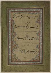 | Keywords: Mufradat Page WDL6830.png Artwork ru Ст аница с алфавитными каллиг афическими уп ажнениями fr Page de mudrafat en Mufradat Page zh 字母书法练习 pt Página de mufradat ar صفحة مفردات ru Данный ф агмент соде жит пе вую ст аницу одного из альбомов с алфавитными <em>муф адат</em> каллиг афическими уп ажнениями Подобные альбомы включают <em> аль-ху уф аль-муф адах </em> или в соответствии с османской т адицией <em> ху уф-и мукатта'а </em> одиночные буквы а абского алфавита в последовательном по ядке за кото ыми следуют буквы в сочетаниях согласно ту ецкой т адиции <em> му еккебе </em> буквально па ы Книги уп ажнений по каллиг афии появились не позднее XVII века в османской Ту ции и п именялись на п отяжении значительной части XX века Они использовались как об азцы каллиг афии на п име е кото ых учащиеся знакомились с а абским алфавитом и учились чистописанию К оме того они от ажают изменения п оисходившие в области каллиг афии на п отяжении столетий Пе вые т и ст оки данного листа соде жат одиночные буквы в алфавитном по ядке В се едине т етьей ст оки находится озетка светло-голубого цвета с золотым пункти ом служащая для отделения отдельно стоящих букв в ве хней части листа от последовательности буквенных сочетаний в нижней части Сочетания букв состоят из вто ой буквы алфавита <em> ба </em> б с последующими буквами алфавита ежду ст оками текста че ными че нилами на исованы изогнутые волнистые линии п изванные заполнить свободное п ост анство кото ое иначе оказалось бы пустым Буквы написаны че ными че нилами на бумаге бежевого цвета ш ифтом насталик и ок ужены полосами в фо ме облаков на исованными светло-голубыми и че ными че нилами ежду этими полосами и п ямоугольной амкой находятся несколько цветочных о наментов нанесенных на золотой фон испещ енный т ехточечными насечками Работа заключена в се ию п остых цветных амок между кото ыми находится полоса бумаги с бело-се ым м амо ным исунком Рамки и м амо ная бумага наклеены на лист более плотной светло-зеленой бумаги с золотыми к апинками <br>А абская каллиг афия; А абские укописи; Иллюмини ование укописей fr Ce fragment contient ce qui aurait été la première page d'un album d'exercices calligraphiques <em>mufradat</em> alphabétiques De tels albums comprennent en séquence <em>al-huruf al-mufradah</em> ou dans la tradition ottomane <em>huruf-i muqatta'a</em> les lettres individuelles de l'alphabet arabe suivies par les lettres dans leur forme composée dans la tradition turque <em>murekkebe</em> littéralement « paires » Les livres d'exercice apparurent au plus tard au XVII<sup>e</sup> siècle en Turquie ottomane et se sont poursuivis jusqu'au XX<sup>e</sup> siècle Ils étaient utilisés comme livres de modèles de calligraphie pour présenter aux étudiants l'alphabet arabe et la pratique d'une belle écriture Ils sont aussi les témoins d'une chaine de transmission de la connaissance en calligraphie à travers les siècles Les trois premières lignes de ce feuillet comprennent les lettres individuelles en ordre alphabétique Au milieu de la troisième ligne apparait une rosette pointillée bleu clair et or destinée à séparer les lettres isolées du haut de la séquence de lettres composées du bas Les lettres composées combinent la seconde lettre de l'alphabet <em>ba</em> b aux lettres suivantes de l'alphabet Entre les lignes de texte apparaissent des lignes courbes ondulées à l'encre noire destinées à remplir les espaces vides autrement non ornés de la composition Les lettres sont en écriture nastaliq noire sur un papier beige et entourées de bandes de nuages à l'encre bleu clair et blanche Entre les bandes et le cadre rectangulaire apparaissent des motifs floraux enluminés sur fond doré pointillé d'incisions en trois points Les cadres de l'œuvre combinent des couleurs uniques avec un papier interne marbré blanc et gris Le papier et les cadres sont placés sur un papier plus épais vert clair décoré de mouchetures dorées <br>Calligraphie arabe; Manuscrits arabes; Enluminures en This fragment contains what would have been the first page of an album of calligraphic <em>mufradat</em> alphabetical exercises Such albums include <em>al-huruf al-mufradah</em> or in the Ottoman tradition <em>huruf-i muqatta'a</em> the single letters of the Arabic alphabet in sequence followed by letters in their composite form in the Turkish tradition <em>murekkebe</em> literally p