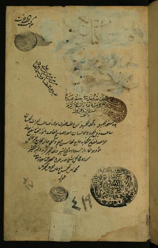 | Keywords: Muhammad ibn Pir Ahmad al-shahir bi-Ibn Arghun al-Shirazi - Page with Former Ownership Notations and Seals - Walters W5911A - Full Page.jpg This folio from Walters manuscript W 591 is the first page of the manuscript inscribed with various ownership statements seals of previous owners and a bequest waqf entry islamic 1512 918 Ottoman ink pigments laid paper cm 18 11 5 accession number W 591 1A 79992 Izzat date and mode of acquisition unknown ex libiris min kutub seal erased on fol 1a 'Abd al-Qadir date and mode of acquisition unknown ex libris fol 1a Muhammad Amin Inspector of awqaf date and mode of acquisition unknown bequest entry on behalf of Bashir Agha with seal and the shelfmark 419 on fol 1a bequest waqf seal of of Bashir Agha dated 1130 AH/AD 1717 the same seal is also present on fols 2a 35a 52a and 77b the shelfmark 419 is also inscribed on the tail edge al-Hajj Bashir Agha Dar al-Sa'adah 1130 AH/AD 1717 by bequest ex libiris dated 1158 AH/AD 1745 plus his seal on fol 1a middle of the page the same seal is also on fols 32b and 78a Henry Walters Baltimore date and mode of acquisition unknown Walters Art Museum Henry Walters Acquired by Henry Walters place of origin Bursa Turkey Walters Art Museum license 2D Book on Logic by Muhammad ibn Pir Ahmad al-shahir bi-Ibn Arghun al-Shirazi Walters MS 591 1510s seals |
