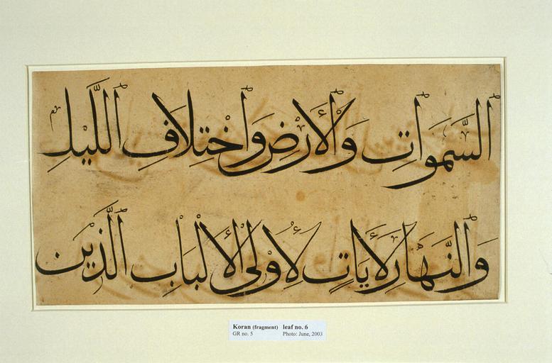Keywords: Muhaqqaq script - Qur'anic verses.jpg en Parts of verses 190-191 of the 3rd chapter of the Qur'an entitled Surat Al 'Imran The Family of 'Imran The text is executed in a crisp and fully vocalized muhaqqaq script on a light beige paper and may have been executed in Persia or Central Asia during the early 15th century LOC-calligraphy ascs 284 Unknown Calligrapher century 15 PD-Art Muhaqqaq style Qur'an manuscripts 15th century Library of Congress Arabic Persian and Ottoman calligraphy collection