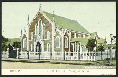 | Keywords: outdoor photo border Photograph on postcard shows a brown wooden church building with white painted uprights and window surrounds and a green roof. It is surrounded by a white picket fence. There is a street lamp on the far right. Quantity: 1 colour photo-mechanical print(s). Physical Description: Colour photolithograph on postcard, 89 x 137 mm. Muir & Moodie (Firm). Muir and Moodie (Firm) :R. C. Church, Westport, N.Z. 4892 P. Muir & Moodie. "New-West-Coast" series. New Zealand post-card, issued by Muir & Moodie Dunedin, N.Z. from their copyright series of views. Printed in Saxony [ca 1910]. [Postcards of the Wesport and Buller area, collected by William Robert Jones. 1900-1970s]. Ref: Eph-A-POSTCARDS-Jones-04. Alexander Turnbull Library, Wellington, New Zealand. natlib.govt.nz/records/22878882 Photograph on postcard shows a brown wooden church building with white painted uprights and window surrounds and a green roof. It is surrounded by a white picket fence. There is a street lamp on the far right. Quantity: 1 colour photo-mechanical print(s). Physical Description: Colour photolithograph on postcard, 89 x 137 mm. Muir & Moodie (Firm). Muir and Moodie (Firm) :R. C. Church, Westport, N.Z. 4892 P. Muir & Moodie. "New-West-Coast" series. New Zealand post-card, issued by Muir & Moodie Dunedin, N.Z. from their copyright series of views. Printed in Saxony [ca 1910]. [Postcards of the Wesport and Buller area, collected by William Robert Jones. 1900-1970s]. Ref: Eph-A-POSTCARDS-Jones-04. Alexander Turnbull Library, Wellington, New Zealand. natlib.govt.nz/records/22878882 |