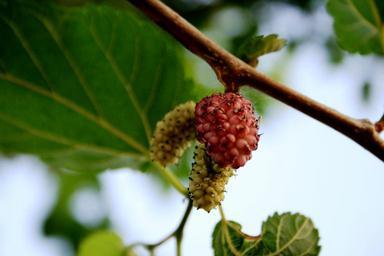 Keywords: mulberry white pink delicate sweet ripe fruit branch leaf green sky