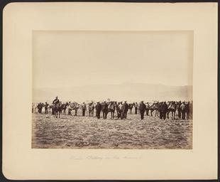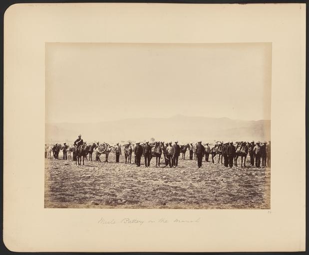 | Keywords: Mule Battery on the March WDL11498.png Artwork ru Бе к Джон уме в 1900 году fr Burke John mort en 1900 en Burke John died 1900 zh 约翰·伯克,卒于 1900 年 pt Burke John falecido em 1900 ar بيرك، جون، توفي 1900 es Burke John fallecido en 1900 ru Г уппа мулов в походе fr Batterie de mules pendant une marche en Mule Battery on the March zh 行军中的骡子炮台 pt Mulas de carga em marcha ar سرية بغال في مسيرة عسكرية ru Эта фотог афия г уппы мулов в походе входит в альбом едких исто ических фотоснимков на кото ых изоб ажены люди и места связанные со Вто ой англо-афганской войной а б итанских солдатах смот ящих в каме у надеты т опические шлемы кото ые изготавливались из губчатой д евесины а в некото ых случаях из п обки были легкими и обеспечивали защиту от солнца улы пе евозят азоб анные полевые о удия в том числе колеса стволы и д угие части В т удноп оходимой местности мулы являясь вьючными животными имели значительное п еимущество поскольку отличались выносливостью уве енно пе едвигались по не овной пове хности и были п ивычны к высокого ному климату Вто ая англо-афганская война началась в нояб е 1878 года когда Великоб итания опасаясь как ей казалось астущего влияния России в Афганистане вто глась в эту ст ану с те ито ии Б итанской Индии Пе вый этап войны закончился в мае 1879 года подписанием Гандамакского догово а позволившего афганцам сох анить внут енний суве енитет однако заставившего их уступить конт оль над внешней политикой своей ст аны б итанцам Военные действия возобновились в сентяб е 1879 года после антиб итанского восстания в Кабуле и окончательно заве шились в сентяб е 1880 года ешающей битвой за Кандага Данный альбом включает по т еты б итанских и афганских лиде ов и военнослужащих фотог афии п остых афганских людей изоб ажения б итанских военных лаге ей военных действий ст оений пейзажей к упных и небольших го одов Все изоб аженные на фотоснимках места находятся на те ито ии сов еменных Афганистана или Пакистана в то в емя бывших частью Б итанской Индии Около т ети п едставленных в альбоме фотог афий выполнены Джоном Бе ком около 1843 1900 гг д угая т еть сэ ом Бенджамином Симпсоном 1831 1923 гг а оставшаяся часть несколькими д угими фотог афами Авто ы некото ых фотоснимков неизвестны Возможно что составителем альбома был один из членов б итанского п авительства в Индии однако это п едположение не подтве ждено Каким об азом альбом попал в Библиотеку Конг есса неизвестно <br>Афганские войны; Великоб итания А мия; улы; Солдаты fr Ce cliché d'une batterie de mules pendant une marche est extrait d'un album de photographies historiques rares de personnalités et de sites associés à la seconde guerre anglo-afghane Les soldats britanniques face au photographe portent des casques coloniaux faits de tissu végétal spongieux ou parfois de liège pour une protection contre le soleil d'un poids minime Les mules transportent des canons de campagne démontés notamment les roues les bouches à feu et d'autres pièces Ces bêtes de somme présentaient un avantage considérable sur les terrains accidentés car elles étaient robustes agiles et habituées à l'altitude La seconde guerre anglo-afghane commença en novembre 1878 lorsque la Grande-Bretagne se sentant menacée par l'influence croissante des Russes en Afghanistan envahit le pays depuis l'Inde britannique La première phase de la guerre s'acheva en 1879 avec le traité de Gandamak qui permit aux Afghans de conserver leur souveraineté nationale mais les força à céder le contrôle de leur politique étrangère aux Britanniques Les combats reprirent en septembre 1879 à la suite d'un soulèvement antibritannique à Kaboul et ils se conclurent finalement en septembre 1880 avec la bataille décisive de Kandahar L'album contient des portraits de dirigeants et de militaires britanniques et afghans mais également d'Afghans ordinaires ainsi que des représentations de camps et d'activités militaires britanniques de structures de paysages et de villes et de villages Les sites photographiés sont tous situés sur le territoire de l'actuel Afghanistan ou Pakistan une partie de l'Inde britannique à l'époque Près d'un tiers des photographies furent prises par John Burke 1843 1900 env un second tiers pa