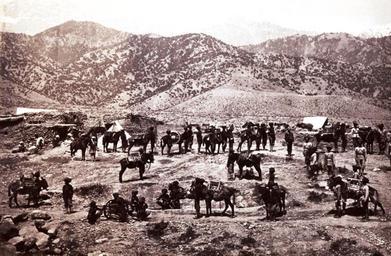 | Keywords: Mule Battery WDL11495 crop.png Artwork ru Бе к Джон уме в 1900 году fr Burke John mort en 1900 en Burke John died 1900 zh 约翰·伯克,卒于 1900 年 pt Burke John falecido em 1900 ar بيرك، جون، توفي 1900 es Burke John fallecido en 1900 ru Г уппа мулов fr Batterie comptant des mules en Mule Battery zh 骡子炮台 pt Bateria de mulas ar سرية البغال ru Эта фотог афия г уппы мулов входит в альбом едких исто ических фотоснимков на кото ых изоб ажены люди и места связанные со Вто ой англо-афганской войной В п ошлом мулы использовались в воо уженных силах для т анспо ти овки п ипасов в т удноп оходимой местности а иногда и в качестве пе едвижных огневых платфо м для пушек небольшого калиб а К оме того мулы служили тягловой силой для пе емещения тяжелых колесных полевых о удий по ненадежным го ным т опам в Афганистане а снимке одно из таких более к упных полевых о удий находится на пе еднем плане слева в ок ужении сипаев индийских солдат воевавших в Б итанской а мии Вто ая англо-афганская война началась в нояб е 1878 года когда Великоб итания опасаясь как ей казалось астущего влияния России в Афганистане вто глась в эту ст ану с те ито ии Б итанской Индии Пе вый этап войны закончился в мае 1879 года подписанием Гандамакского догово а позволившего афганцам сох анить внут енний суве енитет однако заставившего их уступить конт оль над внешней политикой своей ст аны б итанцам Военные действия возобновились в сентяб е 1879 года после антиб итанского восстания в Кабуле и окончательно заве шились в сентяб е 1880 года ешающей битвой за Кандага Данный альбом включает по т еты б итанских и афганских лиде ов и военнослужащих фотог афии п остых афганских людей изоб ажения б итанских военных лаге ей военных действий ст оений пейзажей к упных и небольших го одов Все изоб аженные на фотоснимках места находятся на те ито ии сов еменных Афганистана или Пакистана в то в емя бывших частью Б итанской Индии Около т ети п едставленных в альбоме фотог афий выполнены Джоном Бе ком около 1843 1900 гг д угая т еть сэ ом Бенджамином Симпсоном 1831 1923 гг а оставшаяся часть несколькими д угими фотог афами Авто ы некото ых фотоснимков неизвестны Возможно что составителем альбома был один из членов б итанского п авительства в Индии однако это п едположение не подтве ждено Каким об азом альбом попал в Библиотеку Конг есса неизвестно <br>Афганские войны; Великоб итания А мия; улы; Солдаты fr Ce cliché d'une batterie de mules est extrait d'un album de photographies historiques rares de personnalités et de sites associés à la seconde guerre anglo-afghane Historiquement les armées utilisèrent les mules comme moyen de transport des équipements sur les terrains difficiles et parfois comme plates-formes de tir mobiles pour de petits canons Les mules permettaient également de tracter des canons de campagne à roues plus lourds sur les chemins de montagne escarpés d'Afghanistan Un canon de ce type légèrement plus grand est visible à gauche au premier plan de la photographie entouré de cipayes soldats indiens de l'armée britannique La seconde guerre anglo-afghane commença en novembre 1878 lorsque la Grande-Bretagne se sentant menacée par l'influence croissante des Russes en Afghanistan envahit le pays depuis l'Inde britannique La première phase de la guerre s'acheva en 1879 avec le traité de Gandamak qui permit aux Afghans de conserver leur souveraineté nationale mais les força à céder le contrôle de leur politique étrangère aux Britanniques Les combats reprirent en septembre 1879 à la suite d'un soulèvement antibritannique à Kaboul et ils se conclurent finalement en septembre 1880 avec la bataille décisive de Kandahar L'album contient des portraits de dirigeants et de militaires britanniques et afghans mais également d'Afghans ordinaires ainsi que des représentations de camps et d'activités militaires britanniques de structures de paysages et de villes et de villages Les sites photographiés sont tous situés sur le territoire de l'actuel Afghanistan ou Pakistan une partie de l'Inde britannique à l'époque Près d'un tiers des photographies furent prises par John Burke 1843 1900 env un second tiers par sir Benjamin Simpson 1831 1923 et le reste par plusieurs autres photographes Les auteurs de certains clichés ne sont pas ide