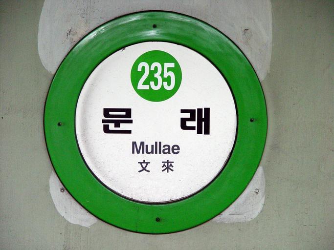 Keywords: Mullae Station Supporting Column Sign.JPG Mullae Station sign on a supporting column Own 2007-11 Jpbarrass Mullae Station Train station signs in Seoul Subway line 2