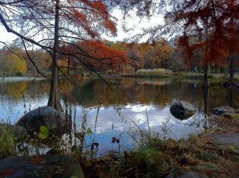 Keywords: munich westpark park water waters mirroring autumn mood autumn colorful leaves tree larch bank clear silent harmonious meditative atmospheric idyllic coloring harmony lake clouds nature shrubs bushes plant