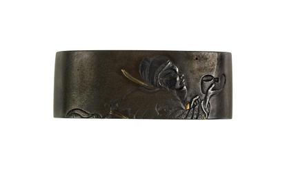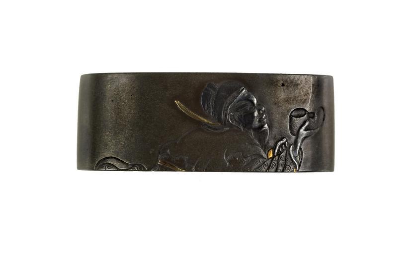 | Keywords: Murakoshi Shigeyuki - Fuchi with Chôryô Holding Kôsekikô's Shoe - Walters 51980.jpg The figure on this fuchi is the Chinese government minister Chry Ch Zhang Liang Chang Liang who lived in the 3rd century BC In his hand is a shoe belonging to the legendary elder Ksekik Ch Huangshi Gong Hwang Shi Kung While riding a mule across a bridge Ksekik dropped his sandal Chry returned it to him As a reward Ksekik gave Chry a book of military strategy Later Chry helped to establish the Han Han Dynasty 207 BC-AD 220 This fuchi is paired with a kashira depicting Ksekik Walters 51 981 ca 1800 Edo shibuichi gold cm 3 7 l accession number 51 980 40531 William T / Henry Walters Collection Baltimore date and mode of acquisition unknown Walters Art Museum Henry Walters Acquired by William T or Henry Walters Signature Shigeyuki place of origin Edo present-day Tokyo Japan Walters Art Museum license Fuchi in the Walters Art Museum Murakoshi Shigeyuki Kōsekikō Chōryō |
