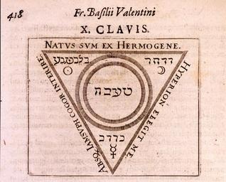 | Keywords: Musaeum Hermeticum 1678 X. Clavis AQ38 Key 10.tif Matthaeus Merian 1593 “1650 From Tripus aureus hoc est Tres tractatus chymici selectissimi nempe I Basilii Valentini benedictini ordinis monachi Germani practica una cum 12 clavibus et appendice ex germanico; II Thomae Nortoni angli philosophi crede mihi seu ordinale ante annos 140 ab authore seriptum nunc ex anglicano manuscripto in latinum translatum phrasi eujusque authoris ut et sententia retenta; III Cremeri cuiusdam abbatis westmonasteriensis angli testamentum hactenus nondum publicatum nunc in diversarum nationum gratiam editi et figuris cupro affabre incisis ornati operâ et studio Michaelis Maieri phil et med d com p c Francofurti apud Hermannum à Sande MDCLXXVII as published in the collection Musaeum hermeticum reformatum et amplificatum Francofurti Apud Hermannum à Sande 1678 In Latin The part in question 'I Basilii Valentini benedictini ordinis monachi Germani practica una cum 12 clavibus et appendice ex germanico;' or 'Basil Valentine a German monk of the Benedictine order one study with the twelve keys and the appendix translated from the German ' Around a downward pointing radiant triangle are the words NATVS SVM EX HERMOGENE top I am born from Hermogenes HYPERION ELEGIT ME right side descending Hyperion elected me and ABSQ IAMSVPH COGOR INTERIRE left side ascending Without Iamsoph I am destined to perish Inside the vertices of the triangle are the symbols of the Sun on the left the Moon on the right and Mercury at the bottom with Hebrew lettering Within the triangle is a double radiant circle inside of which are written Hebrew letters The Hebrew lettering does not correspond to identifiable Hebrew words http //othmerlib chemheritage org/record b1035996~S6 Catalog Information From the copy in the Roy G Neville Historical Chemical Library http //www chemheritage org/ Chemical Heritage Foundation Downloaded with permission from the Chemical Heritage Foundation as part of the Wikipedian in Residence initiative Chemical Heritage Foundation http //www chemheritage org/ Chemical Heritage Foundation 1678 PD-old-100 PD-old-100 cc-by-3 0 Chemical Heritage Foundation Musaeum Hermeticum Archives Images from the Chemical Heritage Foundation Twelve Keys of Basil Valentine PD-old-100 |