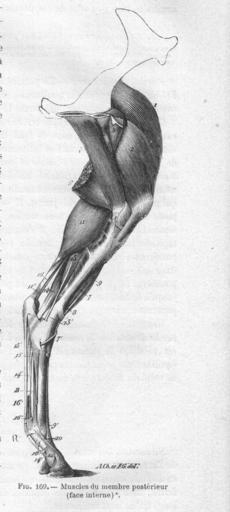 Keywords: MusclesMbreCaudIntChevalChauveau1890CM.jpg en The internal muscles of the hindleg of the horse Equus caballus fr Les muscles internes du membre caudal du Cheval Equus caballus <br /> 1 droit cranial antérieur de la cuisse rectus femoris 2 vaste médial vaste interne vastus medialis 3 pectiné m pectineus 4 grand adducteur de la cuisse m adductor magnus 5 petit adducteur m adductor brevis 6 demi-membraneux semimembranosus 7 portion charnue du fléchisseur du métatarse 7' son tendon d'insersion au petit cunéiforme 8 sa corde tendineuse 9 extenseur antérieur des phalanges 10 la bride qu'il reçoit du ligament suspenseur du boulet 11 jumeau interne 11' tendon terminal des jumeaux m gastrocnemius 12 poplité m politeus 13 fléchisseur oblique des phalanges 14 fléchisseur profond des phalanges perforant m flexor digitorum profundus 14' son tendon 15 sa bride métatasienne 16 tendon du fléchisseur superficiel des phalanges perforé planto-perforé m flexor digitorum superficialis 16' anneau qu'il fournit au perforant A ligament latéral interne de l'articulation fémoro-tibiale B ligament suspenseur du boulet <br /> ” Chauveau Auguste Arloing Saturnin Traité d'anatomie comparée des animaux domestiques <br /> 1 064 p page 371 1890 Paris Lib J B Baillière et Fils domaine public décès des auteurs 1917 et 1911 Meyer Ch 2011-04-04 PD-old Horse leg anatomy Horse muscles Hindlimbs |