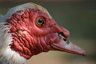 Keywords: muscovy duck bird animal wildlife nature red beak fowl white bill close plumage feather eye closeup face head portrait avian