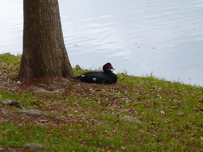 Keywords: muscovy duck black and white city park ocala florida water resting