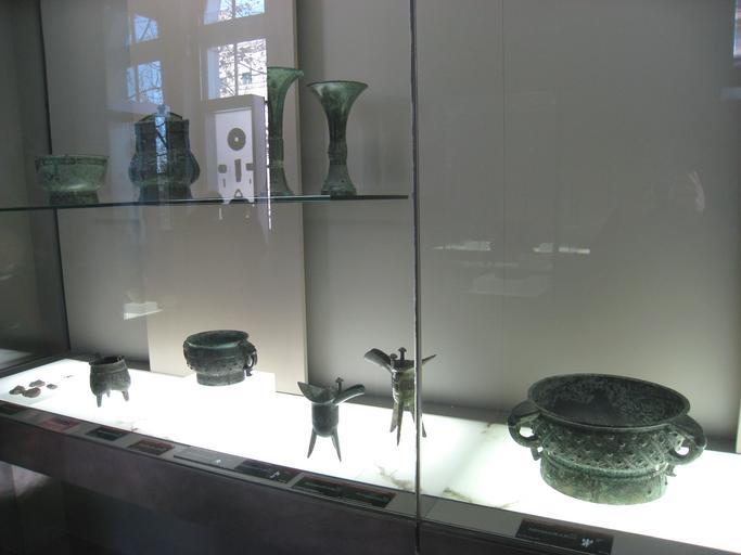 | Keywords: Musée Cernuschi - bronzes 2.JPG en Musée Cernuschi Paris France - Chinese bronzes <br> lower part from right to left Gui 2 Jue a gui an jia and unknown small elements at far left <br> upper part 2 gu probably a hu and unknown element at far left<br> The original work is old enough so that copyright if any has long since expired The museum imposed no restrictions on photography except prohibiting flash in writing and when I explicitly asked; thus the original image appears free of copyright restrictions own I took this photograph 2008-02-07 Daderot Own work all rights released Public domain Art of China in the Musée Cernuschi Ritual bronze vessel of China |