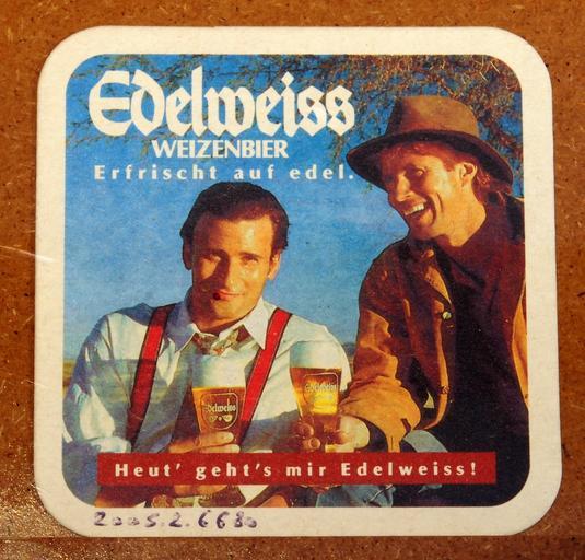 Keywords: Musée Européen de la Bière, Beer coaster pic-039.JPG Edelweiss Photographed through glass own 2012-08-16 16 10 11 AlfvanBeem CC-zero Trademarked Musée Européen de la Bière Nostalgia by Alf van Beem Beermats Edelweiss beer
