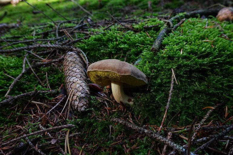 Keywords: mushroom forest pine cones moss branches tap green gathering cep nature softwood