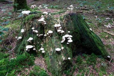 Keywords: mushrooms tree stump forest white beige moss green forest floor autumn forest autumn