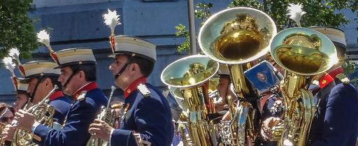 Keywords: music band parade royal guard military in formation uniform honor guard military service army trombone wind instruments caps troop hoisting