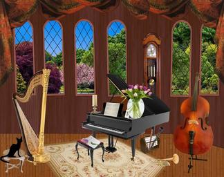 Keywords: music musicians musical instrument violin flute instruments piano recorder harp windows grandfather clock vase tulips still life double bass draperies sheet music black cat trumpet