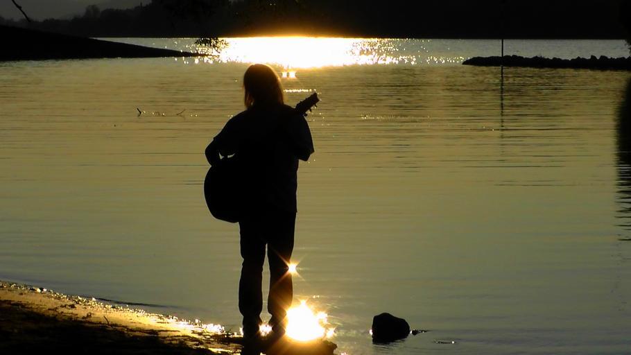 Keywords: musician guitarist musical silhouette twilight guitar instrument music evening sunset riverside abendstimmung atmosphere rhine romance romantic