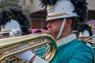 Keywords: musician marching trombone band instrument sound parade celebration uniform