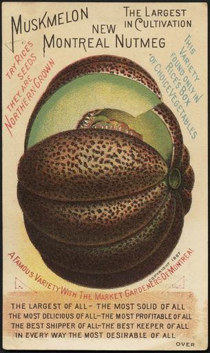 Keywords: Muskmelon, the largest in cultivation - new Montreal Nutmeg. This variety found only in Rice's box of choice vegetables. (front).jpg </b> 1 print chromolithograph ; 14 x 8 cm <b>Genre</b> Advertising cards <b>Subject</b> Melons; Seeds <b>Notes</b> Title from item <b>Collection</b> 19th Century American Trade Cards <b>Location</b> Boston Public Library Print Department <b>Rights</b> No known restrictions Flickr http //flickr com/photos/24029425 N06/8960921895 Muskmelon the largest in cultivation - new Montreal Nutmeg This variety found only in Rice's box of choice vegetables front 2013-01-23 18 47 49 Boston Public Library User Flickr upload bot/upload 05 27 21 October 2013 UTC Oaktree b PD-100 60px Melons Montreal melons