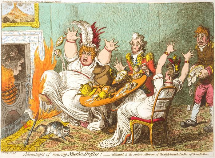 | Keywords: Muslin-Dresses-Gillray.jpeg Advantages of wearing Muslin Dresses ” dedicated to the serious attention of the Fashionable Ladies of Great Britain Js Gillray inv ft SUMMARY A fat lady sitting with a man and woman at a tea table reacts in horror as a hot poker from the fire falls on her dress and sets it on fire The man sits helplessly while the second woman upsets the table in her alarm A butler entering the room drops a plate of muffins and a cat scampers away from the fire A painting of Mt Vesuvius hangs over the fireplace MEDIUM 1 print etching hand-colored CREATED/PUBLISHED London H Humphrey 1802 Feby 15th According to Wright Evans Historical and Descriptive Account of the Caricatures of James Gillray 1851 OCLC 59510372 p 466 Muslin dresses had become very fashionable at the period when this caricature was published and several disastrous results of accidental ignition gave to this print a peculiar air of truthfulness It may be that those interested in the print trade encouraged the production of what was likely to remove prestige from its rival Library of Congress Prints Photographs Division LC-USZC4-8774 color film copy transparency http //memory loc gov/master/pnp/cph/3g00000/3g08000/3g08700/3g08774u tif uncompressed archival TIFF version 49 MB level color pick white point adjust black level cropped and converted to JPEG quality level 88 with the GIMP 2 4 5 1802-02-15 creator James Gillray No known restriction on publication File Advantages of wearing muslin dresses by James Gillray jpg LOC-image cph 3g08774 PD-old-100 James Gillray Caricatures of the United Kingdom Accidents in art Females with white dresses in art Fire in art Fireplaces in art Muslin dresses 1802 cartoons Clothing of the United Kingdom 1800s dresses English muffins in art |