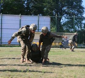 | Keywords: animal dog outdoor pet YAVORIV, Ukraine - Ukrainian Soldiers drag a simulated wounded Soldier to a safe area in order to provide tactical field care during combat lifesaver exercise, August 5, 2016. Soldiers of 6th Squadron, 8th Cavalry Regiment, 2nd Infantry Brigade Combat Team, 3rd Infantry Division conducted the exercise to show Ukrainian Soldiers how to treat wounded Soldiers in combat. Soldiers of 6-8 Cav are here in support of the Joint Multinational Training Group-Ukraine. JMTG-U is responsible for training Ukrainian land forces and building a team of Ukrainian cadre who will ultimately assume that responsibility. The training is designed to reinforce defensive skills of the Ukrainian Ground Forces in order to increase their capacity for self-defense. (U.S.Army photo by Spc. John Onuoha / Released) YAVORIV, Ukraine - Ukrainian Soldiers drag a simulated wounded Soldier to a safe area in order to provide tactical field care during combat lifesaver exercise, August 5, 2016. Soldiers of 6th Squadron, 8th Cavalry Regiment, 2nd Infantry Brigade Combat Team, 3rd Infantry Division conducted the exercise to show Ukrainian Soldiers how to treat wounded Soldiers in combat. Soldiers of 6-8 Cav are here in support of the Joint Multinational Training Group-Ukraine. JMTG-U is responsible for training Ukrainian land forces and building a team of Ukrainian cadre who will ultimately assume that responsibility. The training is designed to reinforce defensive skills of the Ukrainian Ground Forces in order to increase their capacity for self-defense. (U.S.Army photo by Spc. John Onuoha / Released) |