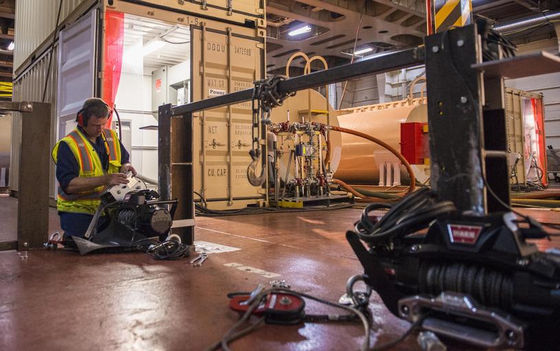 Keywords: MV Cape Ray 140617-N-XB010-002.jpg en Eric Copeland a chemical operator for Edgewood Chemical Biological Center aboard MV Cape Ray repairs a crank that will help move drums containing chemical agent to feed into the Field Deployable Hydrolysis System for neutralization on the ship during an exercise in operating the FDHS Cape Ray is tasked with the neutralization of specific chemical materials from Syria in accordance with the Organization for the Prohibition of Chemical Weapons guidelines while operating in international waters <br>Unit Defense Media Activity 2014-06-17 ECBC https //www dvidshub net/image/1433587/mv-cape-ray 140617-N-XB010-002 2014-07-03 10 56 NAVAL STATION ROTA ES PD-USGov-Military-Navy Naval Station Rota Images from DoD uploaded by Fæ |
