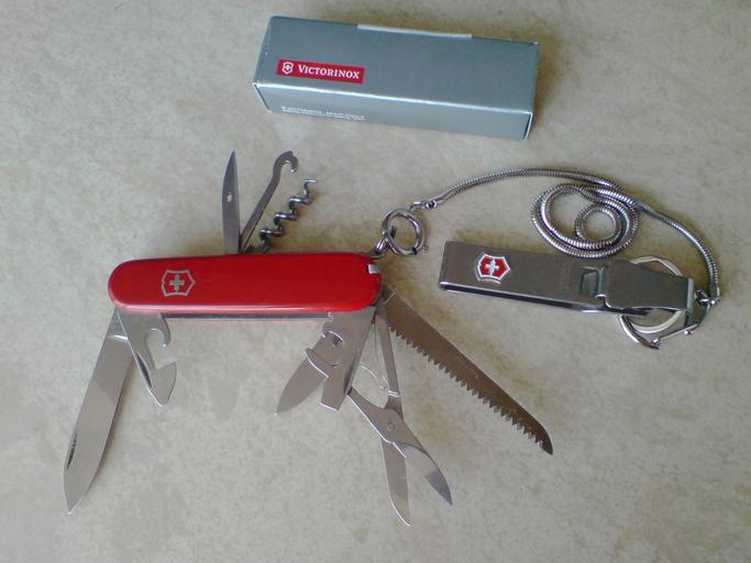 Keywords: My swiss army knife.JPG Huntsman - Victorinox Swiss army knife with knife chain and belt clip Own 2008-08 Biso Trademark Victorinox Swiss Army knives with red plastic scales Corkscrew tool - Swiss-knife