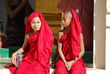 Keywords: myanmar buddhism monk boys guys children red traditionally tradition sit