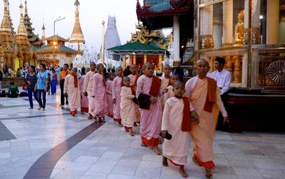 | Keywords: architecture asia bâtiment birman birmanie buddhist burma golden myanmar pagodas rangoon rangoun shwedagon sky stupa temple www.wbayer.com wwwwbayercom La pagode est située à 2 km du centre ville de Yangon, au n°1, Shwedagon Pagoda Road. Elle repose sur une plate-forme pavée de marbre de 5,6 hectares, au sommet de la colline de Singuttara, à 51 m au-dessus de la ville. Elle domine l'horizon. On y accède par des escaliers et des ascenseurs situés aux quatre points cardinaux. Deux chinthes (lions mythiques) monumentaux gardent l'entrée sud ; ils ont été offerts par roi Tharrawaddy lors de sa visite en 18418. La pagode principale se trouve au milieu d'un vaste complexe de 72 autres pagodes, pagodons, salles de prières, tazaungs, pyatthats9 et autres édifices religieux à l'architecture typiquement birmane, ainsi que de très nombreuses statues de bouddhas et de nats. Le stûpa atteint la hauteur de 98 mètres. Sa base est faite de briques recouvertes de milliers de plaques d'or. Elle est entourée d'une forêt de 64 petits pagodons10 qui forment une petite enceinte avec 4 temples plus grands situés aux points cardinaux. Sur la flèche se trouve une sorte d'ombrelle, appelée le hti en birman où sont accrochées 1065 clochettes d'or et 420 clochettes d'argent11, ainsi qu'une girouette ornée de pierres précieuses. Elle se termine par le seinbu, une petite sphère d'or incrustée de milliers de diamants12 dont une émeraude13 de 76 carats. La pagode est située à 2 km du centre ville de Yangon, au n°1, Shwedagon Pagoda Road. Elle repose sur une plate-forme pavée de marbre de 5,6 hectares, au sommet de la colline de Singuttara, à 51 m au-dessus de la ville. Elle domine l'horizon. On y accède par des escaliers et des ascenseurs situés aux quatre points cardinaux. Deux chinthes (lions mythiques) monumentaux gardent l'entrée sud ; ils ont été offerts par roi Tharrawaddy lors de sa visite en 18418. La pagode principale se trouve au milieu d'un vaste complexe de 72 autres pagodes, pagodons, salles de prières, tazaungs, pyatthats9 et autres édifices religieux à l'architecture typiquement birmane, ainsi que de très nombreuses statues de bouddhas et de nats. Le stûpa atteint la hauteur de 98 mètres. Sa base est faite de briques recouvertes de milliers de plaques d'or. Elle est entourée d'une forêt de 64 petits pagodons10 qui forment une petite enceinte avec 4 temples plus grands situés aux points cardinaux. Sur la flèche se trouve une sorte d'ombrelle, appelée le hti en birman où sont accrochées 1065 clochettes d'or et 420 clochettes d'argent11, ainsi qu'une girouette ornée de pierres précieuses. Elle se termine par le seinbu, une petite sphère d'or incrustée de milliers de diamants12 dont une émeraude13 de 76 carats. |