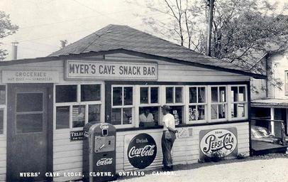 | Keywords: myers cave lodge myerscavelodge myer's cave myerscave snack bar snackbar charles mcgregor charlesmcgregor ebenezer perry ebenezerperry eva perry evaperry marble lake marblelake outdoor text Carol Morrow of the CDHS wrote an excellent history of the Myers Cave Lodge (including the snack bar) in the Pioneer Times 2009, spring edition. Snippets of the article are below: The family of Charles McGregor had emigrated from Mas- sachusetts in 1860 to the Tweed area. In 1881 he married Eva Perry, a daughter of Ebenezer Perry. In 1891 they were living at Myers Cave. Records show that Eva transferred her land inheritance to her husband in 1892, and that year Charles and Eva built a home for their family beside the rapids at the foot of Marble Lake where it joins Georgia Lake. This would eventually become Myers Cave Lodge. At this point, the McGregor-Perry home became a tourist op- aeration with the first guest registered in 1921. The business grew over time, and other buildings were put up by the Perrys, including a barn, dance hall, a canteen and the cottages. Another of the original structures on the property, a log ice- house, still stands today. The Perrys had a good business at Myers Cave. They had guests from as far away as Kentucky, Ohio, Pennsylvania and of course NY state, as well throughout Ontario and the Montreal area. Lillie (daughter of Eva and Charles) and her boys continued on at Myers Cave until 1951 when she sold it.The next people to run the Lodge were Joseph & Barbara Ballah and Kathleen & David Smith, a father/ daughter combination from Toronto. Mr. Ballah died and the Lodge was again under new management in June 1956. Wm H Royle and Lester & Frances Webb from Toronto took over with bookings in place for that season beginning in July. Frances who had mostly worked in a factory, now had to be chief cook and bottle washer for a resort. Being a resourceful type, she confronted the challenge. Together they won back a loyal clientele and improved the services at the Lodge. They continued the suppers to the general public; the Saturday night dances and the animals were already things of the past. They built a beach around the point from the rapids, and put in a road to it from the highway. They upgraded the canteen into a store with groceries and snacks, closed in the open verandah with screens and windows, converted from cooking with wood to gas and electric, and installed the first furnace at the lodge. Be sure to read the entire history. Visit www.cloynepioneermuseum.ca > Newsletters> 2009, Spring. Carol Morrow of the CDHS wrote an excellent history of the Myers Cave Lodge (including the snack bar) in the Pioneer Times 2009, spring edition. Snippets of the article are below: The family of Charles McGregor had emigrated from Mas- sachusetts in 1860 to the Tweed area. In 1881 he married Eva Perry, a daughter of Ebenezer Perry. In 1891 they were living at Myers Cave. Records show that Eva transferred her land inheritance to her husband in 1892, and that year Charles and Eva built a home for their family beside the rapids at the foot of Marble Lake where it joins Georgia Lake. This would eventually become Myers Cave Lodge. At this point, the McGregor-Perry home became a tourist op- aeration with the first guest registered in 1921. The business grew over time, and other buildings were put up by the Perrys, including a barn, dance hall, a canteen and the cottages. Another of the original structures on the property, a log ice- house, still stands today. The Perrys had a good business at Myers Cave. They had guests from as far away as Kentucky, Ohio, Pennsylvania and of course NY state, as well throughout Ontario and the Montreal area. Lillie (daughter of Eva and Charles) and her boys continued on at Myers Cave until 1951 when she sold it.The next people to run the Lodge were Joseph & Barbara Ballah and Kathleen & David Smith, a father/ daughter combination from Toronto. Mr. Ballah died and the Lodge was again under new management in June 1956. Wm H Royle and Lester & Frances Webb from Toronto took over with bookings in place for that season beginning in July. Frances who had mostly worked in a factory, now had to be chief cook and bottle washer for a resort. Being a resourceful type, she confronted the challenge. Together they won back a loyal clientele and improved the services at the Lodge. They continued the suppers to the general public; the Saturday night dances and the animals were already things of the past. They built a beach around the point from the rapids, and put in a road to it from the highway. They upgraded the canteen into a store with groceries and snacks, closed in the open verandah with screens and windows, converted from cooking with wood to gas and electric, and installed the first furnace at the lodge. Be sure to read the entire history. Visit www.cloynepioneermuseum.ca > Newsletters> 2009, Spring. |