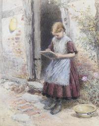 | Keywords: Myles Birket Foster A school girl.jpg A school girl Signed with monogram watercolour over traces of pencil heightenend with touches of bodycolour 24 x 19 cm http //www bonhams com Bonhams by 1899 Creator Myles Birket Foster PD-old-100 Images from Bonhams Myles Birket Foster School children in art Blackboards in art Writing in art Aprons in art Paintings of girls reading outdoors Females looking down in art Standing females in art People leaning against walls People with shoes | ||||