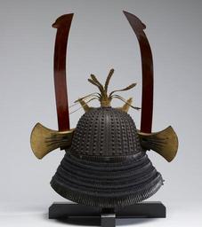 | Keywords: Myochin - Helmet with Phoenix and Battle-Axe Ornaments - Walters 51609 - Back.jpg This helmet has an iron hachi of thirty-three riveted laminations a shikoro of five plates laced in kebiki spread hair style with navy blue ito doshi laces and axes as yokodate made from whale baleen A Phoenix Ho o serves as a maedate; one tail feather is missing It is lined with rawhide between 1825 1875 late Edo iron lacquer silk wood baleen rawhide cm 29 2 accession number 51 609 33679 Bunkio Matsuki Sale A A Gallery New York February 10 1906 no 257 Henry Walters Baltimore February 10 1906 by purchase Walters Art Museum Henry Walters Acquired by Henry Walters 1906 place of origin Japan Walters Art Museum license Japanese armour in the Walters Art Museum Myochin family Kiritsuke hon kozane shikoro Wakidate Suji bachi kabuto Za-boshi kabuto |