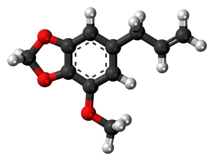 | Keywords: Myristicin-3D-balls.png Ball-and-stick model of the myristicin molecule a mildly hallucinogenic compound found in nutmeg essential oil Colour code 505050 Grey Carbon C<br> F0F0F0 Hydrogen H white<br> F51E1E Oxygen O red<br> 2011-01-22 own DS Visualizer Jynto talk Space-filling version cc-zero Images by Jynto Myristicin |