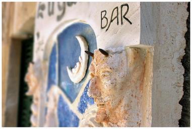 Keywords: mythical creatures mask devil horns bar moon wall sculpture stone figure artwork
