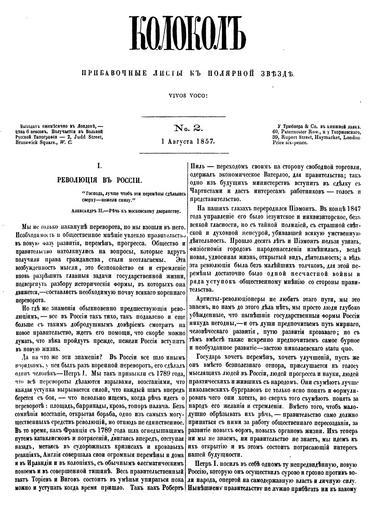 | Keywords: Колокол N2.jpeg en The title page of issue Kolokol 2 The Bell the exile-russian publication of Alexander Herzen and Nikolay Ogarev London 1 aug 1857 First edition ru Пе вая ст аница вто ого номе а издания Ге цена и Ога ёва Колокол Лондон Вольная усская типог афия 1 августа 1857 год Пе вое издание Отскани овано с факсимильного издания 1962 года Сделал сам А И Ге цен П Ога ёв 1 08 1857 PD-old Kolokol Title pages from Russia 1 August Newspapers of Russia 1857 | ||||