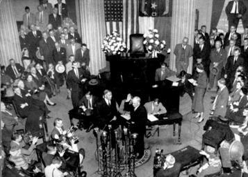 | Keywords: luther b. hodges lutherbhodges governors state capitol statecapitol inaugurations blackandwhite monochrome black and white Inauguration of Governor Luther B. Hodges, 9 November 1954, old House chambers, State Capitol, Raleigh, NC, after the death of Umstead. Hodges had been Lt. Governor just since 1953. From the General Negative Collection, State Archives of North Carolina. Inauguration of Governor Luther B. Hodges, 9 November 1954, old House chambers, State Capitol, Raleigh, NC, after the death of Umstead. Hodges had been Lt. Governor just since 1953. From the General Negative Collection, State Archives of North Carolina. |