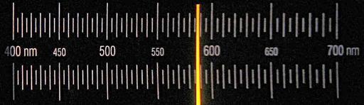 Keywords: Na-D-sodium D-lines-589nm.jpg en Spectroscope photo showing the Sodium-D-Lines at 589nm de Spektroskop-Foto der Natrium-D-Linien bei 589nm einer mit Kochsalz gefärbten Gasflamme own Tfaub Flame test Sodium Spectral lines