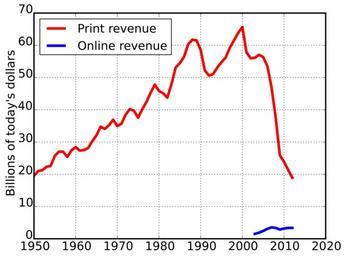 | Keywords: Naa newspaper ad revenue.svg en US newspaper advertising revenue corrected for inflation 2013-06-29 See below Dave Farrance Source Created with Matplotlib Graph and source program are own work by uploader Numerical data from the http //www naa org/Trends-and-Numbers/Newspaper-Revenue aspx Trends Numbers web publication by the Newspaper Association of America and the http //www bls gov/cpi/ tables Consumer Price Index by the United States Department of Labor A similar graph to this appeared previously on the http //mjperry blogspot com/2012/09/freefall-adjusted-for-inflation-print html Carpe Diem blog of Mark J Perry This graph was created with the following Python/Matplotlib script <source lang python > /usr/bin/env python from matplotlib pylab import print1950 2070 2251 2464 2632 2685 3077 3223 3268 3176 3526 3681 3601 3659 3780 4120 4426 4865 4910 5232 5714 5704 6167 6939 7481 7842 8234 9618 10751 12213 13863 14794 16527 17694 20581 23522 25170 26990 29412 31197 32368 32280 30349 30639 31869 34109 36092 38075 41330 43925 46289 48670 44305 44102 44939 46703 47408 46611 42209 34740 24821 22795 20692 18931 onlin2003 1216 1541 2027 2664 3166 3109 2743 3042 3249 3370 infla1950 1 3 7 9 1 9 0 8 0 7 -0 4 1 5 3 3 2 8 0 7 1 7 1 0 1 0 1 3 1 3 1 6 2 9 3 1 4 2 5 5 5 7 4 4 3 2 6 2 11 0 9 1 5 8 6 5 7 6 11 3 13 5 10 3 6 2 3 2 4 3 3 6 1 9 3 6 4 1 4 8 5 4 4 2 3 0 3 0 2 6 2 8 3 0 2 3 1 6 2 2 3 4 2 8 1 6 2 3 2 7 3 4 3 2 2 8 3 8 -0 4 1 6 3 2 2 1 corr1950 array 0 001 len infla1950 for j in range len corr1950 - 2 -1 -1 corr1950j corr1950j+1 100 0 + infla1950j / 100 0 rc 'axes' lw 2 0 plot range 1950 1950 + len print1950 print1950 corr1950 'r-' lw 4 0 label 'Print revenue' plot range 2003 2003 + len onlin2003 onlin2003 corr19502003 - 1950 'b-' lw 4 0 label 'Online revenue' xticks size 18 yticks size 18 va 'baseline' grid lw 0 75 ylabel Billions of today\'s dollars size 18 rc 'legend' fontsize 18 ; legend loc 2 savefig 'naa_newspaper_ad_revenue svg' show </source> With the proviso that some rights to the numerical source data may be retained by the Newspaper Association of America I release the graph and its source program to the public domain cc-zero Advertising Newspaper advertising Commerce Unidentified graphs Images with Python source code |