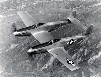| Keywords: naa north american northamerican twin mustang f-82 f82 xf-82 xf82 usaf fighter aircraft airplane vehicle blackandwhite outdoor black and white North American XF-82 (S/N 44-83887) in flight. (U.S. Air Force photo) The F-82 was the last propeller-driven fighter acquired in quantity by the USAF. It appears to be two Mustang fuselages on one wing, but in reality it was a totally new design. Its purpose was to provide a fighter carrying a pilot and co-pilot/navigator to reduce fatigue on long-range bomber escort missions. Delivery from production did not begin until early 1946, too late for World War II. After WWII, radar-equipped F-82s were used quite extensively by the Air Defense Command as replacements for the P-61 night fighter. During the Korean Conflict, Japan-based F-82s were among the first USAF aircraft to operate over Korea. The first three North Korean airplanes destroyed by U.S. forces were shot down by all-weather F-82G interceptors on June 27, 1950. North American XF-82 (S/N 44-83887) in flight. (U.S. Air Force photo) The F-82 was the last propeller-driven fighter acquired in quantity by the USAF. It appears to be two Mustang fuselages on one wing, but in reality it was a totally new design. Its purpose was to provide a fighter carrying a pilot and co-pilot/navigator to reduce fatigue on long-range bomber escort missions. Delivery from production did not begin until early 1946, too late for World War II. After WWII, radar-equipped F-82s were used quite extensively by the Air Defense Command as replacements for the P-61 night fighter. During the Korean Conflict, Japan-based F-82s were among the first USAF aircraft to operate over Korea. The first three North Korean airplanes destroyed by U.S. forces were shot down by all-weather F-82G interceptors on June 27, 1950. |