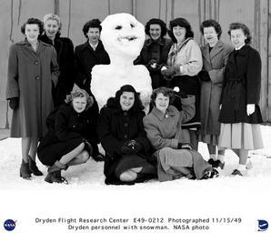 Keywords: naca naca women nacawomen nasa nasa langley research center nasalangleyresearchcenter 1949 groupshot people monochrome The late 1940s saw increased flight activity, and more women computers were needed at the NACA Muroc Flight Test Unit than the ones who had originally arrived in 1946. A call went out to the NACA Langley, Lewis, and Ames laboratories for more women computers. Pictured in this photograph with the snowman are some of the women computers who responded to the call for help in 1948 along with Roxanah, Emily, Dorothy, who were already here. Standing left to right: Mary (Tut) Hedgepeth, from Langley; Lilly Ann Bajus, Lewis; Roxanah Yancey, Emily Stephens, Jane Collons (Procurement), Leona Corbett (Personnel), Angel Dunn, Langley. Kneeling left to right: Dorothy (Dottie) Crawford Roth, Lewis; Dorothy Clift Hughes, and Gertrude (Trudy) Wilken Valentine, Lewis. Image #: NIX-E49-0212 Date: November 15, 1949 The late 1940s saw increased flight activity, and more women computers were needed at the NACA Muroc Flight Test Unit than the ones who had originally arrived in 1946. A call went out to the NACA Langley, Lewis, and Ames laboratories for more women computers. Pictured in this photograph with the snowman are some of the women computers who responded to the call for help in 1948 along with Roxanah, Emily, Dorothy, who were already here. Standing left to right: Mary (Tut) Hedgepeth, from Langley; Lilly Ann Bajus, Lewis; Roxanah Yancey, Emily Stephens, Jane Collons (Procurement), Leona Corbett (Personnel), Angel Dunn, Langley. Kneeling left to right: Dorothy (Dottie) Crawford Roth, Lewis; Dorothy Clift Hughes, and Gertrude (Trudy) Wilken Valentine, Lewis. Image #: NIX-E49-0212 Date: November 15, 1949