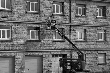Keywords: nacelle work worker city wall urban facade man black and white glass