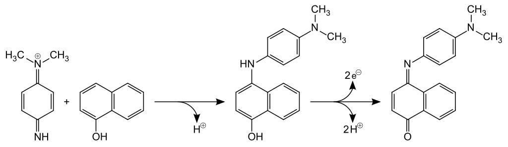 Keywords: NADICoupling.svg validSVG Created with BKchem 001 -check NADI Reaktion oxidative Kopplungsreaktion von 1-Naphthol und N N-Dimethyl-p-phenylendiamin NADI reaction oxidative coupling of 1-naphthol and N N-dimethyl-p-phenylendiamine Own 2010-01-30 Sponk <span class signature-talk >talk</span> PD-chem Reaction mechanisms Naphthol |
