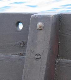 Keywords: Naglemedårette.jpg Detail from an old Norwegian wooden boat showing a treenail Own 10 06 07 Andrva Wooden nails Wooden boats Boats in Norway