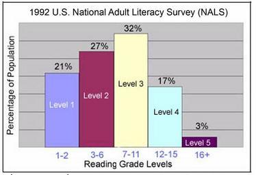 Keywords: Nals.jpg en A chart representing the results of the 1992 National Adult Literacy conducted by the U S National Assessment of Educational Progress own Bdubay Cc-zero 1992 in the United States Literacy Bar charts Diagrams in English