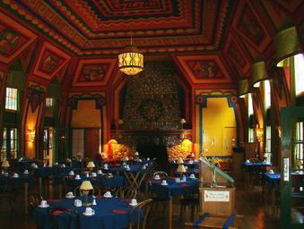 | Keywords: Naniboujou Lodge DR.jpg Naniboujou Lodge on the North Shore of Lake Superior; dining room This was the original commons room of the lodge Cree Indian motifs are reflected in the paint scheme and the sun emblem a welcome symbol in stone inset in the fireplace above the mantel Own Kablammo Naniboujou Lodge |