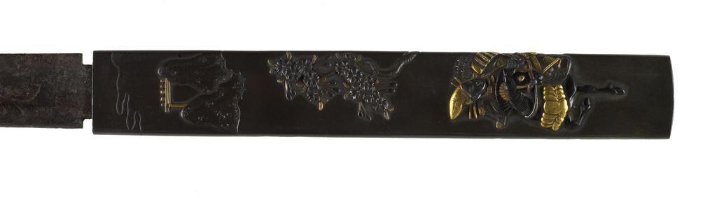 Keywords: Naotaka - Kozuka with Mounted Samurai under Cherry Blossoms - Walters 5112534 - Detail A.jpg A samurai rides a horse along the bottom of the kozuka In the middle ground is a cherry tree in bloom and at the back is a structure in the mountains This may be Sakurai near Osaka where the 14th-century warrior Kusunoki Masashige said goodbye to his son Masatsura before Masashige's death at the battle of Minatogawa This is part of a mounted set century 18 Edo shakudo gold cm 21 4 accession number 51 1253 4 39443 Henry Walters Baltimore date and mode of acquisition unknown Walters Art Museum Henry Walters Acquired by Henry Walters Signature Kôshûsai Naotaka kao place of origin Japan Walters Art Museum license Kozuka in the Walters Art Museum Naotaka Media contributed by the Walters Art Museum needs category review |