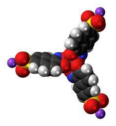 | Keywords: Naphthol Green B 3D spacefill.png Space-filling model of the Naphthol Green B molecule a green dye Color code 505050 Carbon C black<br> F0F0F0 Hydrogen H white<br> F51E1E Oxygen O red<br> 3C50FA Nitrogen N blue<br> AA5EF2 Sodium Na lilac<br> FAEB00 Sulfur S yellow<br> 8078C0 Iron Fe grey-purple<br> 2011-07-18 own DS Visualizer Jynto talk Neutral form ball-and-stick version Neutral form space-filling version Sodium salt ball-and-stick version cc-zero Images by Jynto Dyes Iron complexes O-donor complexes Nitroso compounds Naphthalene sulfonates Sodium salts of organic compounds |