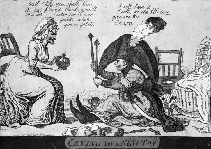 Keywords: Napoleon-nappy-crying-for-a-new-toy-1803-caricature.jpg Crying for a New Toy a January 25th 1803 satirical caricature attributed to Isaac Cruikshank father of George Cruikshank which portrays Napoleon's planned coronation in a rather undignified light Dialogue in image Old Nurse -- Well Child you shall have it but I don't think you'll be a bit better for it nor quieter when you've got it Nappy -- I will have it I will or else I'll cry -- give me the Crown Potty-training chair in background; torn picture of the world and broken crowns and scepters litter the floor 1803-01-25 not stated creator Isaac Cruikshank PD-old-100 1803 cartoons Isaac Cruikshank Caricatures of Napoleon I of France 1803 in France Bicorne hats in engravings Mob caps Nannies in art Nannies in France |